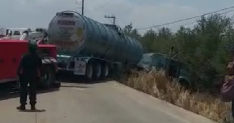 Una pipa se salió del camino para luego volcarse, a un costado del tramo carretero Anáhuac- Puente Prieto.
