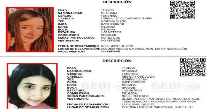 Dulce Yamileth desapareció el 2 de mayo en el municipio de Monterrey; mientras que Karen Aylin fue vista por última vez el pasado 29 de abril en el municipio de Juárez