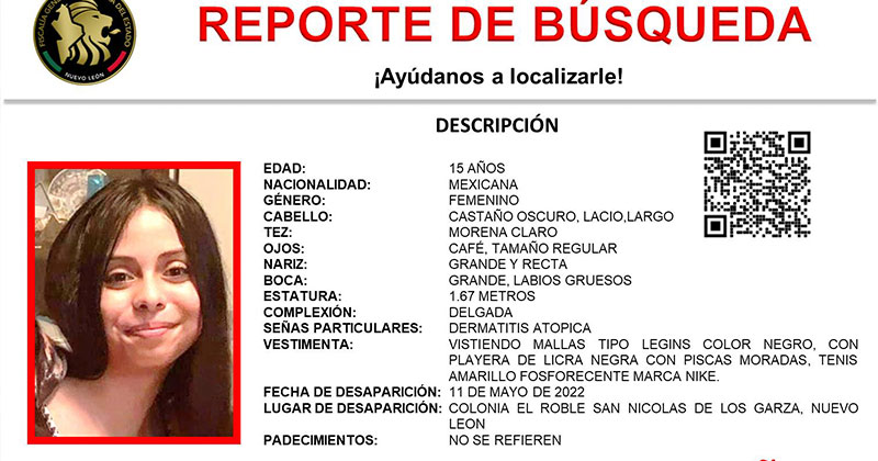 La menor fue vista por última vez ayer miércoles 11 de mayo, en la colonia El Roble, en el municipio de San Nicolás