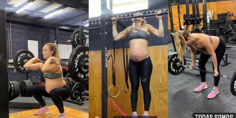 Mujer practica crossfit y levanta pesas en su última semana de embarazo