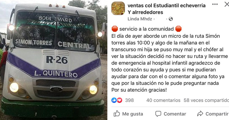 Una vez la mujer y su hija llegaron al Hospital Infantil el chofer retomo su trabajo, sin embargo la mujer no pudo tomar el dato del nombre o número de la unidad por lo que busca al señor para hacerle llegar un presente.