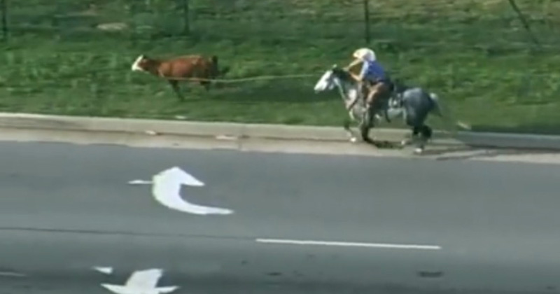 Captan persecución de vaqueros a una vaca en carretera de Estados Unidos
