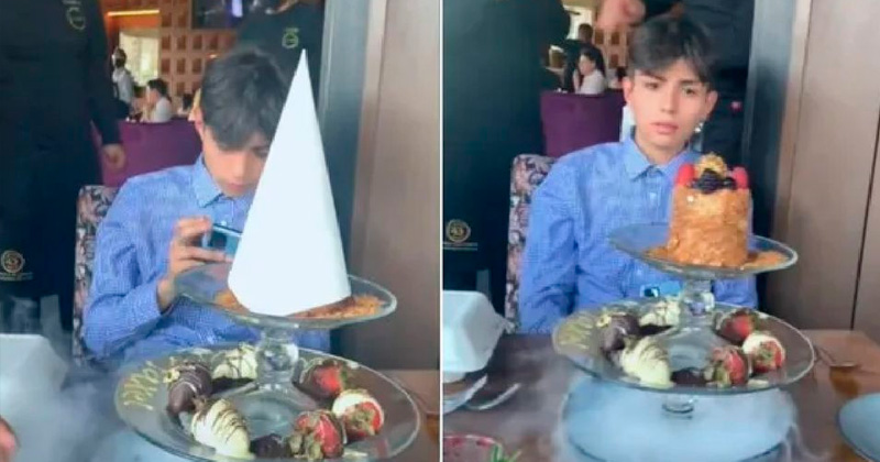 El pequeño estaba en el celular mientras meseros aplaudían por su festejo.