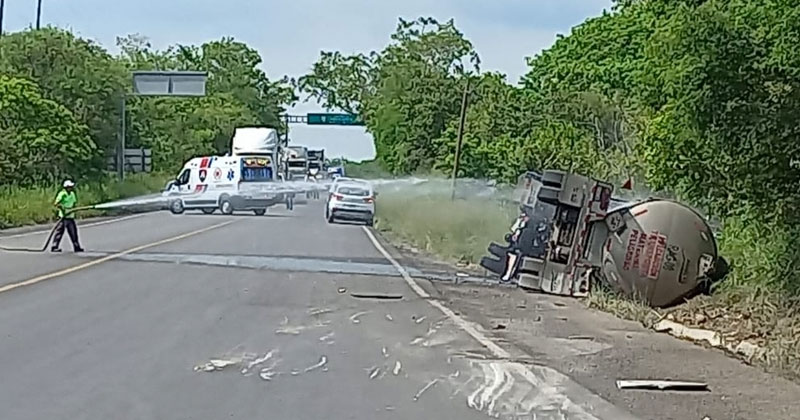 TAMPICO, TAMAULIPAS.- Una pipa cargada con metanol volcó la mañana del jueves, en la carretera federal Tuxpan-Tampico, resultando lesionado el operador.