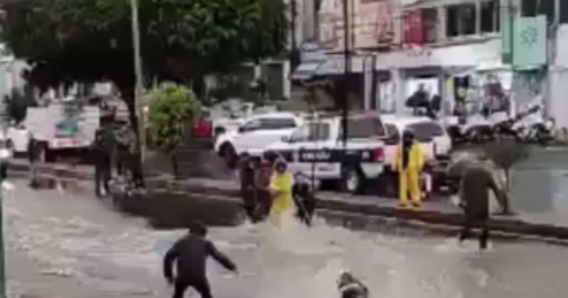 Motociclista intenta desesperadamente no ser arrastrado por la corriente