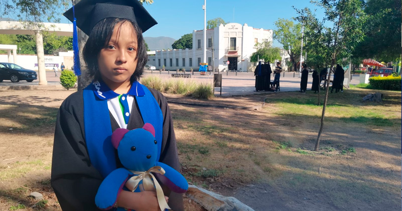 Rosario se toma la foto de graduación con el osito memorial, que se elaboró especialmente para recordar a su mamá recientemente fallecida