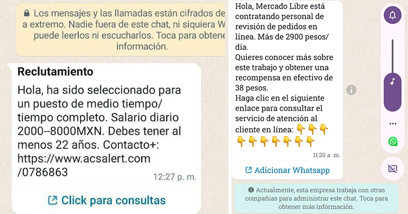 De acuerdo a las autoridades, es un tipo de estafa que circula desde hace tiempo tanto en Latinoamérica como en otras partes del mundo y una vez que se acepta el mensaje y se muestra interesado en la vacante, se pide a la persona realizar compras por Mercado Libre, con la promesa que se le va a devolver una generosa comisión por ello, pero es totalmente falso.