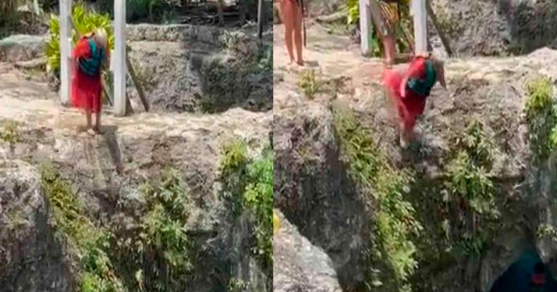 En un video que circula en Tiktok se observa a una abuelita con vestido rojo y chaleco salvavidas estar a la orilla del precipicio, reuniendo valor para arrojarse al agua de lo que parece ser un cenote