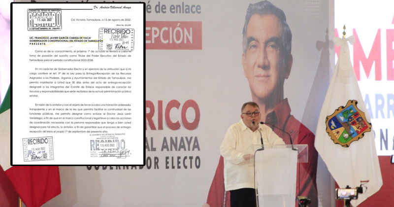 “En mi carácter de Gobernador Electo y en ejercicio de la atribución que a mi cargo confiere el artículo 9 de la Ley para la entrega-recepción de los recursos asignados a los Poderes, Órganos y Ayuntamientos del Estado de Tamaulipas, me permito manifestar a Usted que 30 días antes del acto designaré a los integrantes del Comité de Enlace responsable de conocer los recursos y responsabilidades que serán recibidos de la actual administración pública estatal”, indica el oficio que fue recibido esta tarde en la Oficina del Gobernador Francisco García Cabeza de Vaca.