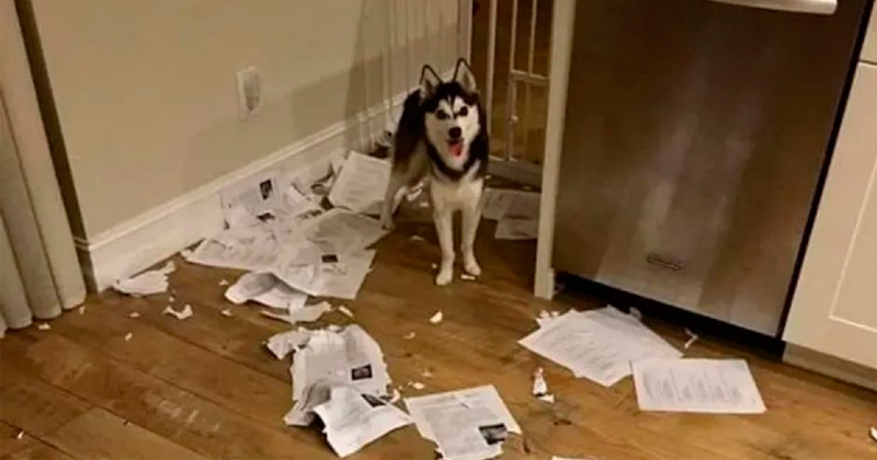 ¡No fue excusa!, un profesor compartió la foto de su perro junto a un caos de hojas rotas y distribuidas por toda la casa