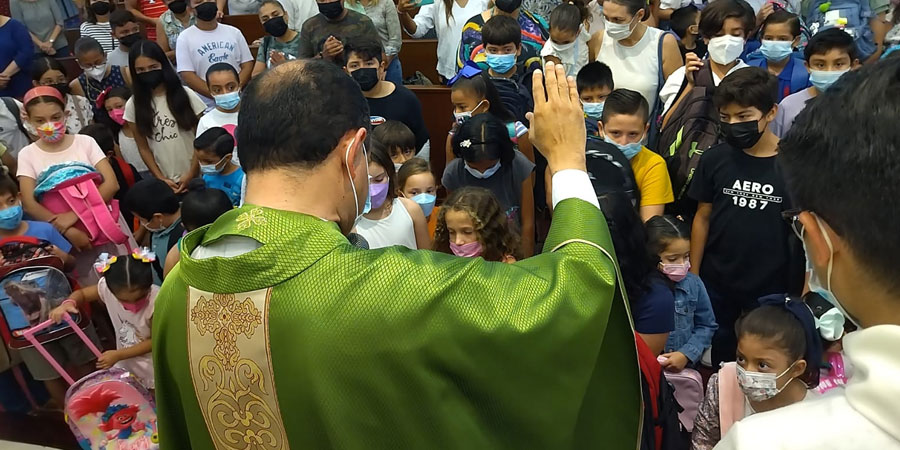 Bendicen a estudiantes y mochilas previo a regreso a clases.