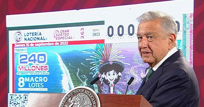 El 15 de septiembre se rifarán 240 mdp en efectivo, así como 8 macrolotes en Playa Espíritu, Sinaloa; lo obtenido será para obras públicas, afirmó
