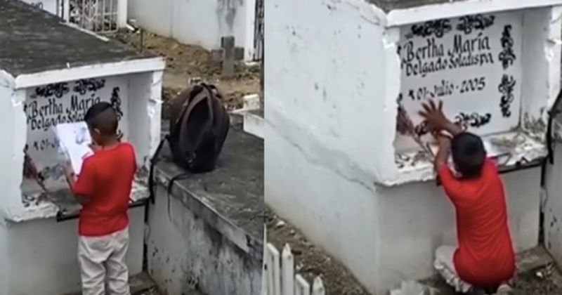 Pequeño visita tumba de su mamá para llevarse flores y sus calificaciones