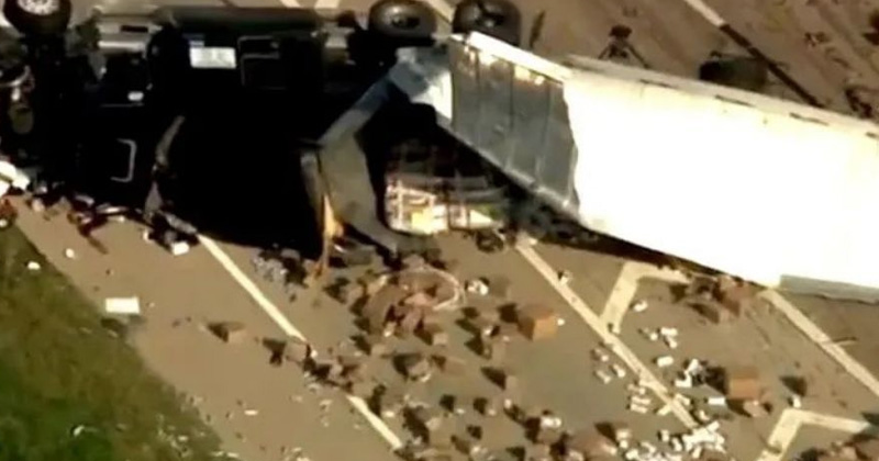Se vuelca tráiler en EU, transportaba juguetes para adultos