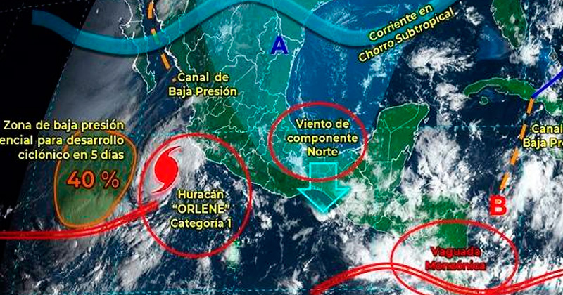 El huracán ‘Orlene’ ocasionará lluvias intensas en regiones de Colima y Jalisco; muy fuertes en Guerrero, Michoacán, Nayarit y Sinaloa, y fuertes en localidades de Durango.