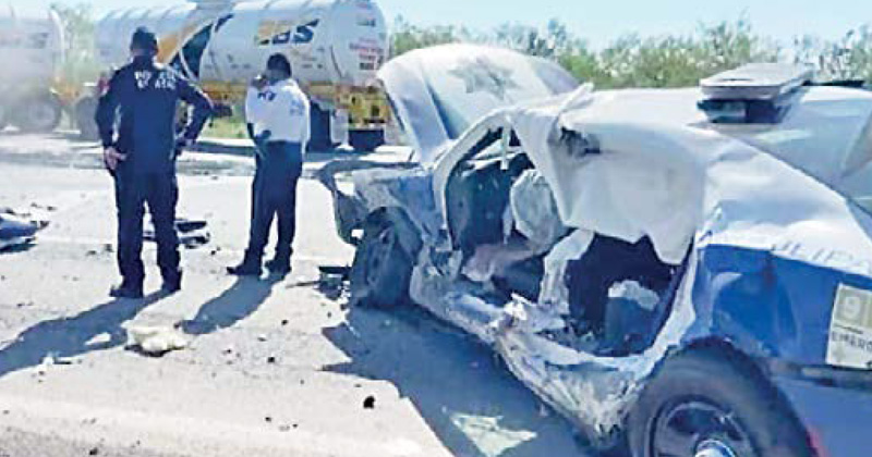 La patrulla en la que viajaban se estrelló contra un tráiler quedó destrozada; el tractocamión transportaba diésel
