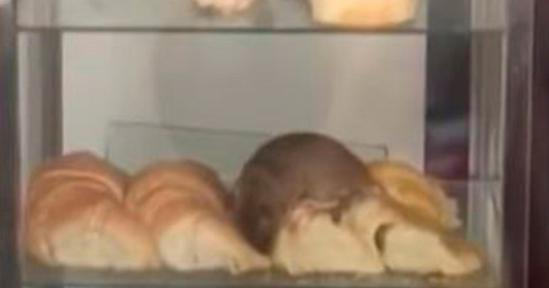En el video podemos ver a la rata gigante caminar sobre los panes del establecimiento.