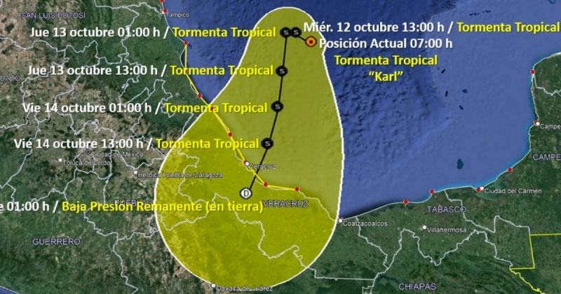 La tormenta tropical ‘Karl’ se localiza a 295 kilómetros de Cabo Rojo, Veracruz, sigue su trayectoria en vivo hoy 12 de octubre de 2022.