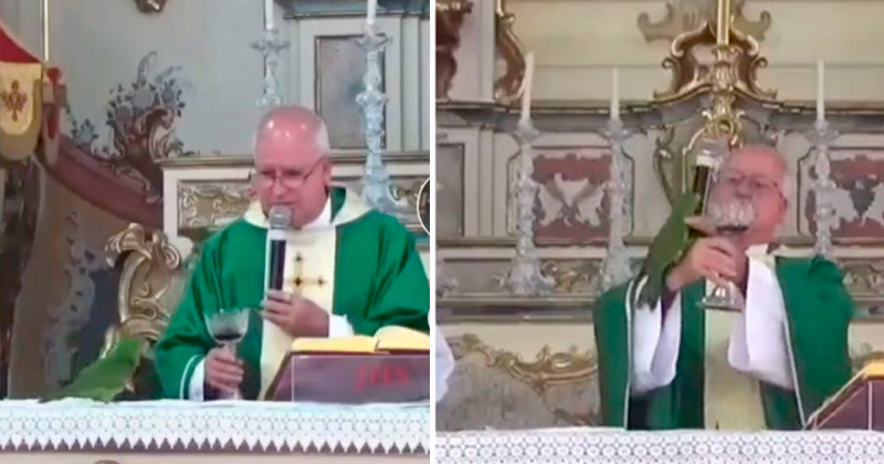 Loro intenta beber vino de consagración y sacerdote hace todo para evitarlo
