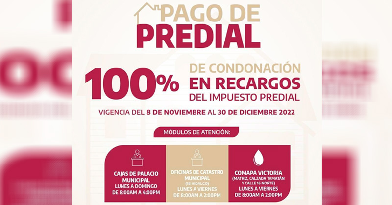 Anuncian condonación de recargos al 100% en el Predial en Victoria