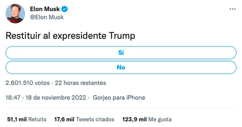 Elon Musk publicó una encuesta para dejar a decisión de los usuarios que Donald Trump regrese o no a Twitter.