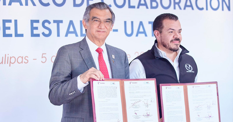 El gobernador Américo Villarreal y el rector Guillermo Mendoza firmaron el convenio que sienta las nuevas bases de colaboración con la UAT, en evento donde también el mandatario estatal presidió la ceremonia de honores y 72 aniversario de la Universidad