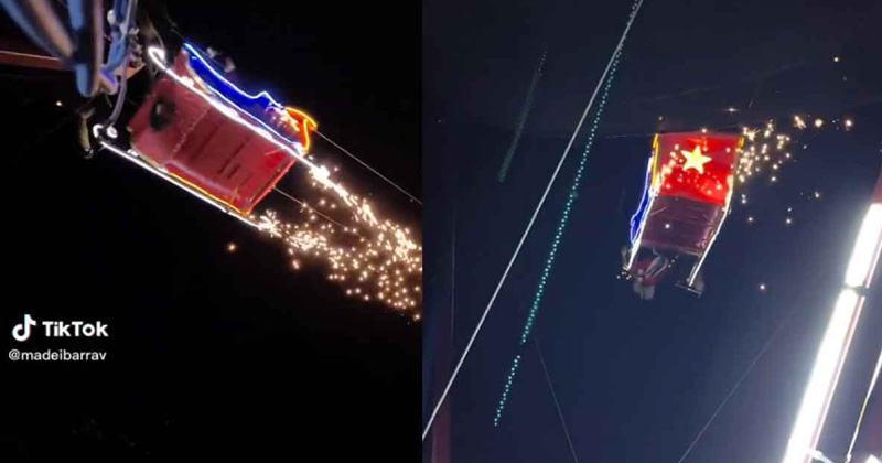 Desde las alturas Santa Claus saludaba a los asistentes al evento cuando su vehículo se detuvo intempestivamente, lo que ocasionó que él saliera proyectado hacia adelante, quedando casi colgado, ya que, presuntamente el operador del trineo pisó el freno
