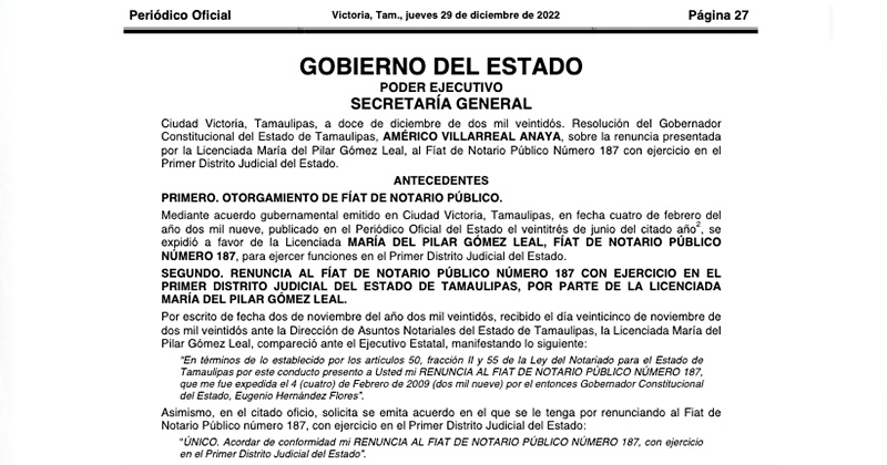 En el Periódico Oficial del Estado se publicó su solicitud y la aceptación por parte del gobernador Américo Villarreal Anaya