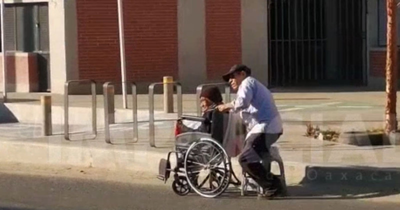 Video. Abuelito sin una pierna empuja la silla de ruedas de su esposa; ya los buscan