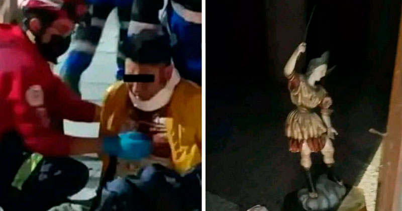 Según se dio a conocer fue la Parroquia Cristo Rey donde el hombre trató de cometer el delito para el que se saltó el barandal; sin embargo, la vista nublada del estado en el que se encontraba terminó por llevarlo a sufrir de una herida de importancia en la garganta. Y es que luego de tropezarse, se golpeó con una figura del Arcángel Miguel, aunque fue la espada la que terminó por causar daños importantes.