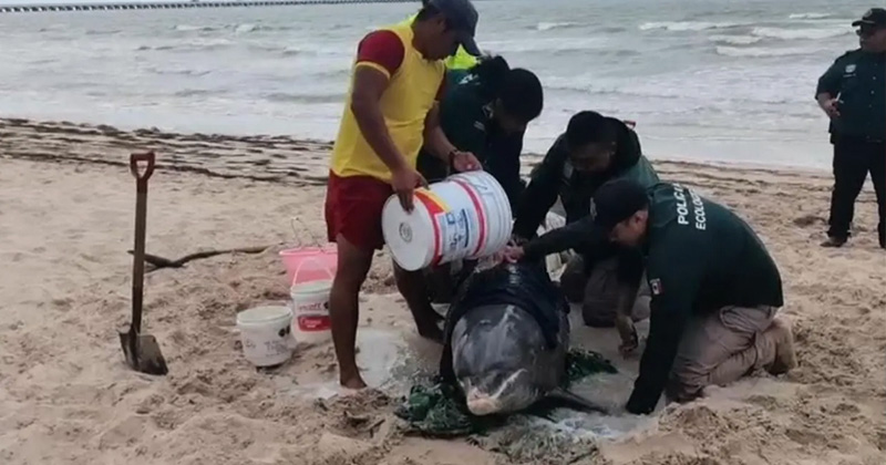 Policías de Yucatán salvan a delfín varado en la playa; lo regresan al mar