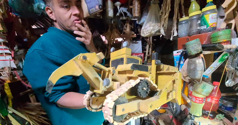 Jaime es un artesano creativo que está vendiendo sus juguetes, vacijas, lámparas, flores y otros artículos elaborados con madera