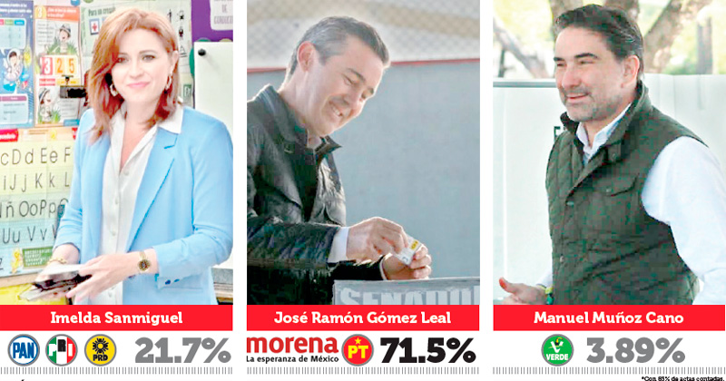 La candidato de la alianza Va por México, de los partidos de Acción Nacional (PAN), Revolucionario Institucional (PRI) y de la Revolución Democrática (PRD), Imelda Margarita Sanmiguel Sánchez, aparecía en segundo lugar con 103,648 sufragios y el 21.8 por ciento de los votos.