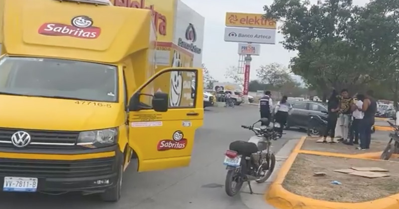 La camioneta repartidora de frituras intentó ganarle el paso a un motociclista, pero falla en su intento y ocurre el percance
