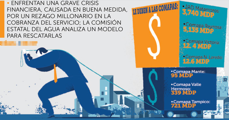 Los organismos operadores del agua enfrentan una grave crisis financiera, causada en buena medida, por un rezago millonario en la cobranza del servicio; la Comisión Estatal del Agua analiza un modelo para rescatarlas
