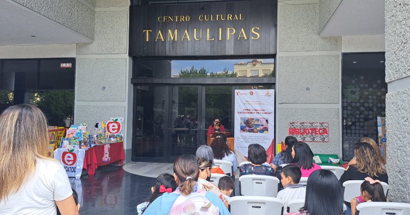 Arman Feria literaria «Lecturando en Familia» en el acceso principal del Centro Cultural Tamaulipas