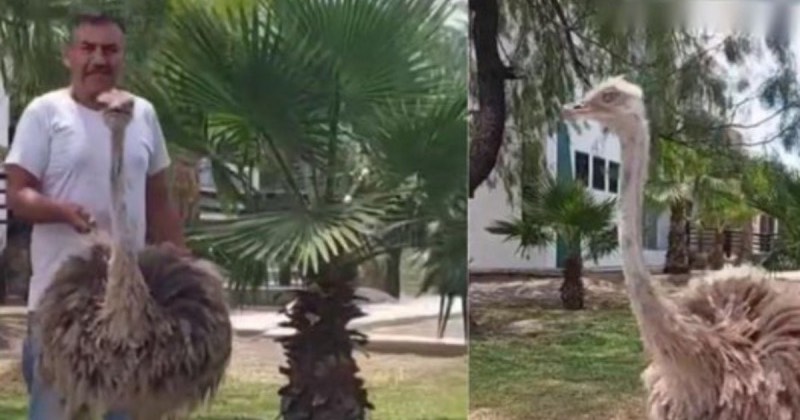 En redes sociales se viralizó este jueves un video en el que aparece un señor paseando hasta con correa una avestruz que tiene de mascota por las calles de Nuevo León.
