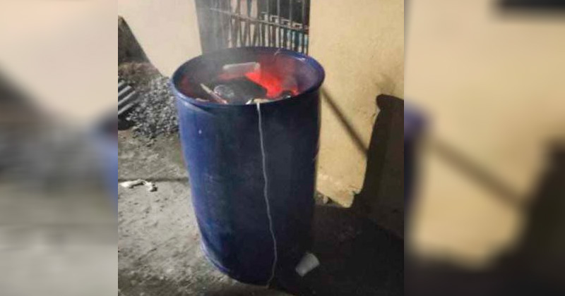 Un contenedor de basura de color azul y a base de plástico fue incendiado por sujetos desconocidos