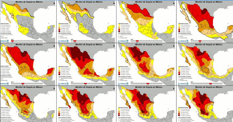 De acuerdo a los datos históricos de sequía, fue en el 2011 cuando toda la Entidad se encontraba en rojo, situación a la cual no se ha llegado aún
