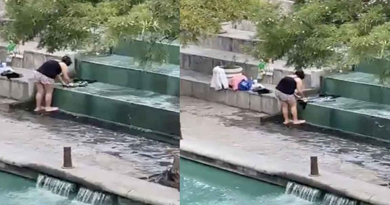 Una persona captó el momento en el que una mujer decidió utilizar el agua del Paseo de Santa Lucía para lavar su ropa