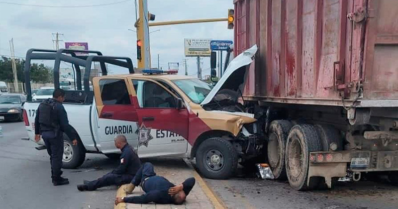 Los oficiales participaban en la persecución de unos delincuentes cuando chocan contra camiones de volteo; en el percance también resulta herido un taxista.