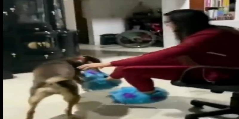 Perro interrumpe en el home office de su dueña y la arrastra por la sala