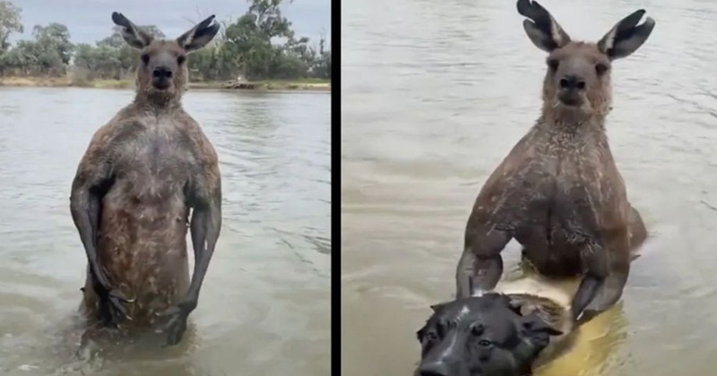 En las imágenes, se puede observar al perro, en apuros, siendo sostenido justo sobre el agua por un canguro salvaje