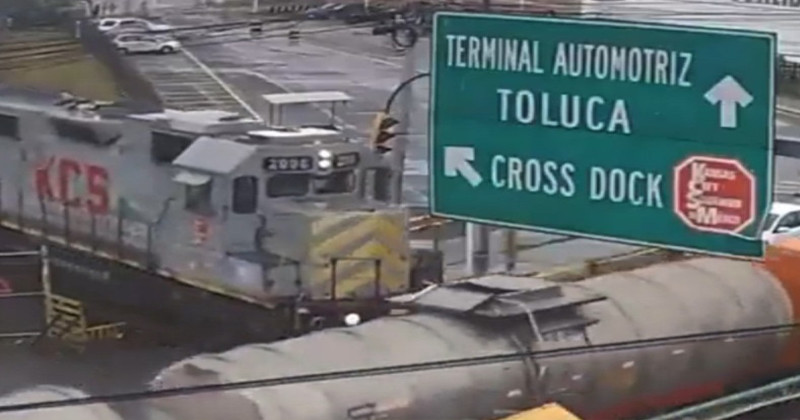 En un video que circula en redes sociales se puede ver cómo el chofer de la pipa con gasolina intenta ganarle el paso al tren en las calles Albert Einstein e Industria Automotriz de Toluca; sin embargo, es impactado por el tren en una de las “salchichas”.