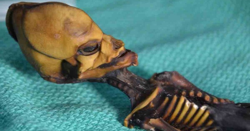 Los restos de sólo 15 centímetros, no tiene rótulas, un cráneo puntiagudo en forma de cono, cuencas oculares inclinadas y diez costillas, además de que no eran un feto humano, sino un ser completamente formado.
