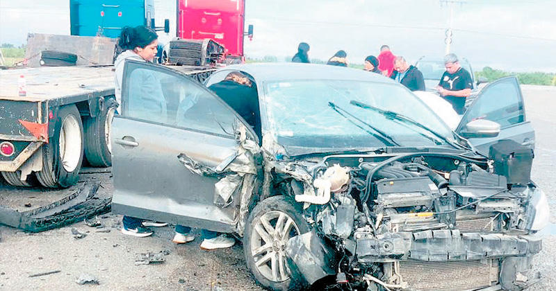 Dos personas originarias de Guanajuato resultan casi ilesas, luego de destrozar el vehículo en el que viajaban contra las llantas de un tráiler cuyo conductor se incorporaba a la carretera sin prudencia.