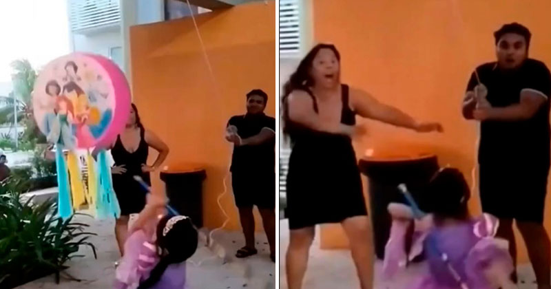 La pequeña estaba muy feliz disfrutando de su celebración hasta que un hombre subió demasiado la cuerda para que ella no alcanzara a pegarle