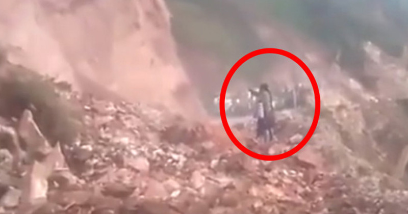 En el video puede verse a la mujer parada justo frente al cerro que estaba a punto de desgajarse, se le nota con los brazos en alto como intentando detener las rocas y toneladas de tierra