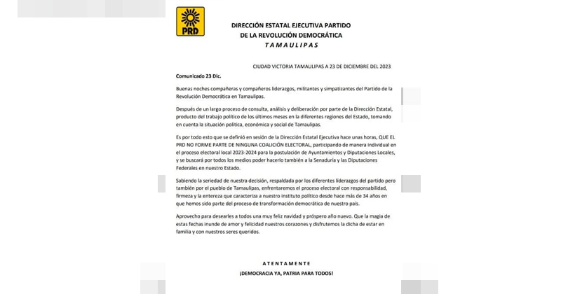 Abandona PRD coalición en Tamaulipas
