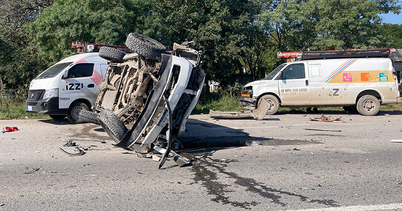 Presuntamente la unidad oficial se incorporó a la carretera sin precaución, chocó contra un trailer y le pegó a dos camionetas